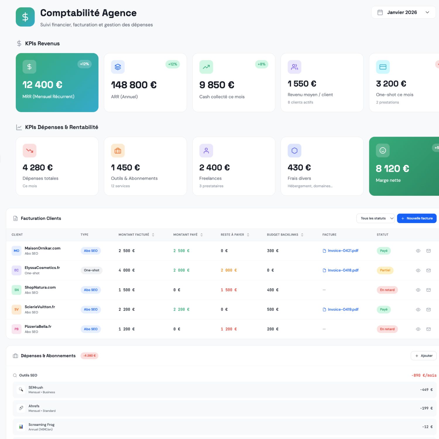 99€/month per client you manage. The more you scale your agency, the more you can deliver with Sorank — we grow with you. No bloated plans eating into your margins, no surprise fees, no paying for seats you don't use. You bill your clients, we help you deliver. Simple.